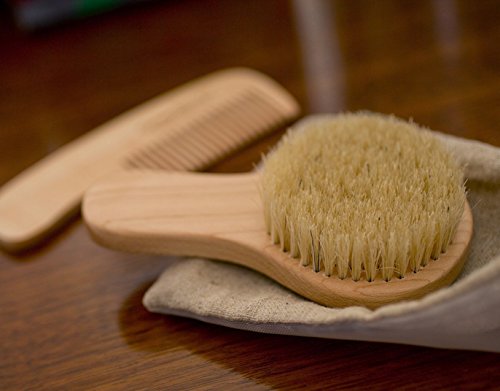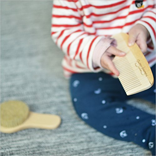 - クセのついた細い髪の毛も赤ちゃんらしくて可愛いですが、写真の撮影やお出掛けの際にはやっぱりきっちりしたいですよね。でも、赤ちゃんの髪の毛ってなかなかセットするのが難しい・・・。櫛も上手く通らないし、水で撫で付けても乾くとすぐに元通りに・・・。そこで活躍するのがこの木製ハンドルのヘアブラシ。ハンドル部分は天然のメープルウッド、さらにブラシには天然の白豚毛を使用した高級感溢れる仕上がり。これを使えば見違えるほど赤ちゃんのヘアースタイルがキレイに整います。髪の毛が長い赤ちゃんのヘアースタイルの仕上げや、または成長してから使えるメープルウッド製の櫛もセット。成長して使う時期が終わっても、飾って置きたくなるようなそんな素敵なヘアブラシと櫛です。キュートな収納袋入りでギフトにもピッタリです。