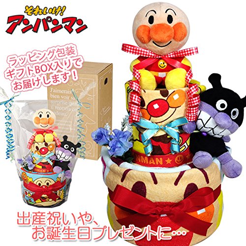 人気のアンパンマンのタオルやぬいぐるみ、おもちゃを使い、かわいいおむつケーキに仕上げておりますので、出産祝いはもちろん、内祝い、100日祝い、ハーフバースデー、初節句、お誕生日プレゼントに大変喜ばれるギフトです。