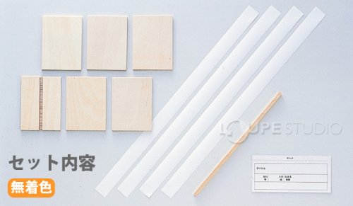 - セット内容:ベニヤ板(溝加工なし)×5、ベニヤ板(溝加工あり)×1、角棒×1、ユポテープ×4、名前札×1