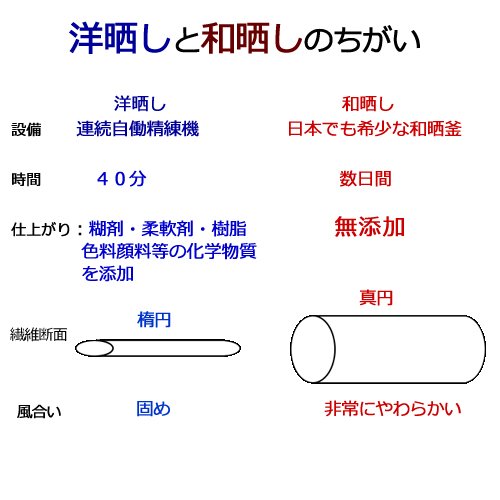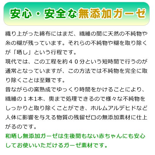 - 安心の無添加。人体に影響のあるホルムアルデヒドなどの残留物質ゼロ。繊維の間に残る不純物を完全に取り除くために「晒し(さらし)」工程を4日間かけて、行ってます。