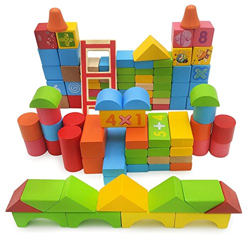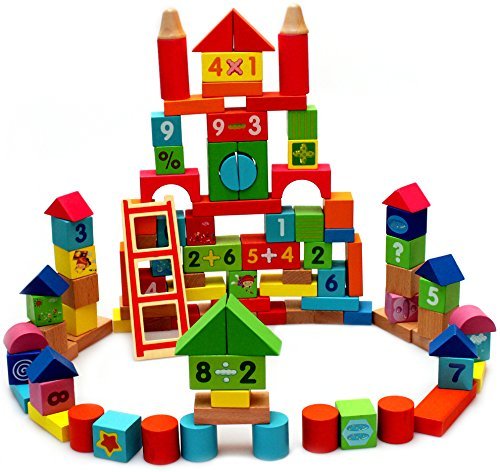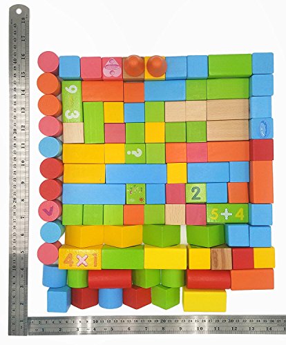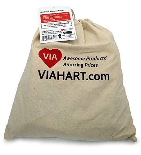VIAHART 100 Piece Natural Wood Beech 123 Numeric Wooden Block Construction Building Set Rainbow Colored with Canvas Bag | 100% Real Wood [並行輸入品]
