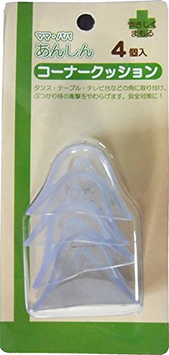 「ママ・パパあんしん コーナークッション 4個入」は、ぶつかり時の衝撃をやわらげるコーナーガード・クッションです。タンス・テーブル・テレビ台などの角に。粘着テープで簡単に取り付けられます。