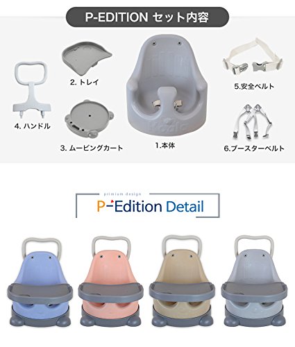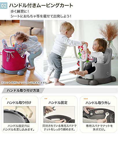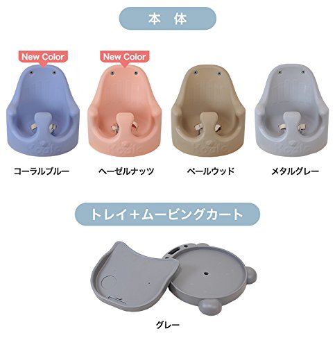 - 床置きで使える本体の他にもいすの上で使用する際に固定させる着脱可能なベルト、安全用腰ベルト、ハンドル付きムービングカート、トレイなどがセットになっております。