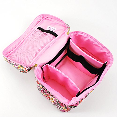■使い方は色々。バニティーケースとは、化粧道具を入れて携帯する小型の箱状手提げかばんのこと。ケース自体の空間が広いので、化粧水やハンドクリームなど大型ケースのものも入ります。間仕切りも取り外し可能なので、空間を仕切って使うことも可能。持ち手も付いているので、移動にも便利です。化粧品はもちろん、おにぎり&スープジャーなどのランチセットを入れたり、趣味の道具を入れておいたり、色々な用途に使えます。■取り外せる仕切り板で空間をアレンジ大型のものも入れられるよう、間仕切りは取り外し可能&可動式にしました。仕切り板の1つにはオープンP、もう一つにはボトルをはめられるようにゴムが2つついています。空間を大きく使いたいけれど、ポケットやボトルフォルダーを使いたい時には、壁に沿わせるように取り付けてください。フラ部分にはメッシュ式のオープンPを付けたので、筆などの細くて長い物も収納できます。 ■表ラミネート加工。表面はビニル加工をしてあるので、汚れにくく、お手入れもしやすくなっています。■仕様 開閉:Wファスナー ■ポケット 外側:なし内側:オープンP(メッシュ)×1 ■付属 仕切り板×2 (1枚はオープンP付き、もう1枚はボトルフォルダー(ゴム付き2カ所)付き