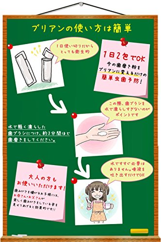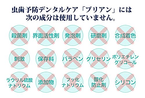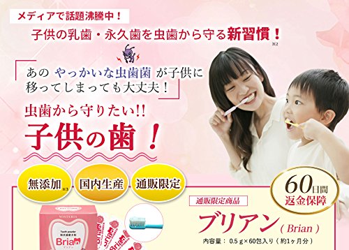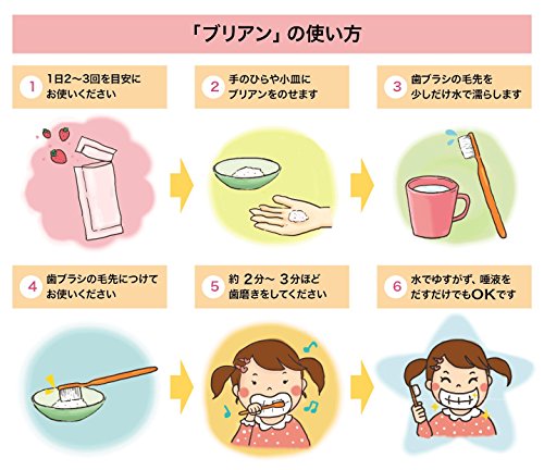『ブリアン』は、歯の生え始めた小さなお子様でもお使い頂ける様、あえて一般的なペースト状の歯磨き粉にはせず、”粉状”の形態を採用させて頂きました。 普段の歯磨きの際に、歯磨き粉の代わりとしてブリアンをお使いいただくだけで、歯垢や汚れを取り除き虫歯を防ぐ事ができます。 特に乳幼児には、お母さんの指にガーゼを巻いて、ブリアンを付けて磨いてあげるとより効果的です。 またブリアンは、お口をゆすぐ必要はありませんので、うがいのできないお子さまでもお使い頂けます。