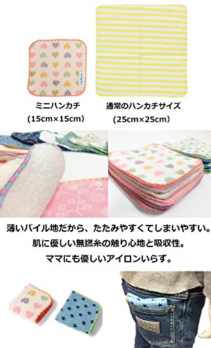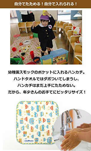 - 15cm×15cmのミニハンカチ。スモックに入るサイズで年少さんのお手てにぴったり。薄手のパイルでやさしくしっかり吸水します。