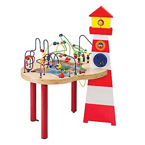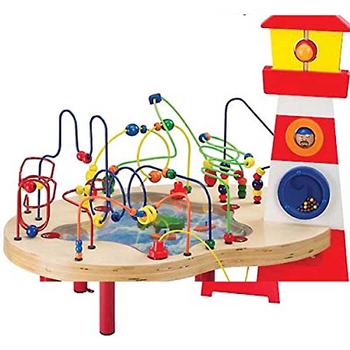 エデュコ社製のルーピングです。サンドテーブルの上を、ボートや海の生き物達が動き回ります。 大きな灯台のライトや、舵輪をクルクル回すことが出来ます。 海から魚がジャンプしてきたり、カモメや嵐がきたりと、子供たちの想像力は、海の上へと広がります。 迫力のある大きなサイズなので、一人ではもちろん、3~4人程度でも遊んでいただけ、保育の現場などでも活躍するサイズです。 床まで遊べる側面のパネルが付属しています。 ビーズなどの部品が外れてしまうこともなく、安全に多くのお子様にお使いいただけます。 テーブルの足はスチール製で、大変丈夫に出来ており、脚を床に固定することも可能です。(※脚部分組み立て要) 大きめサイズのビーズを使用しているので、小さなお子様でもつかみやすく、ストレスを感じることなくダイナミックに遊べます。 手先の技巧性と集中力を養う、エデュコ社のルーピングは、お座りの頃から、ごっこ遊びの頃まで楽しめます。 小さな頃から遊べますので、出産祝いや1歳のお誕生日のプレゼントにもお勧めの木製玩具です。 エデュコ社のボックスに入れてお届けいたします。