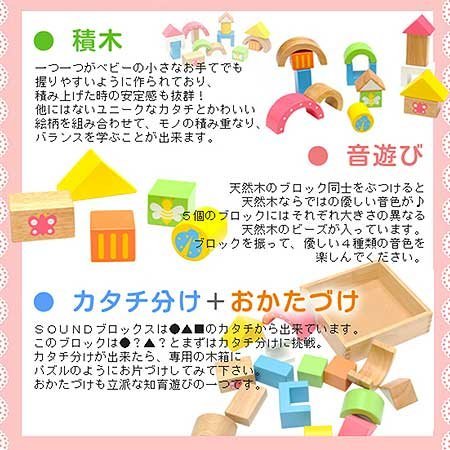 はじめは単純な形の組み合わせを楽しんだり、パーツを振って音を出す遊びでお楽しみいただき、成長に合わせて色分けやカタチ分け、木箱にしまう「おかたづけ」まで知育要素を盛り込んだ遊びでもお楽しみいただけます。