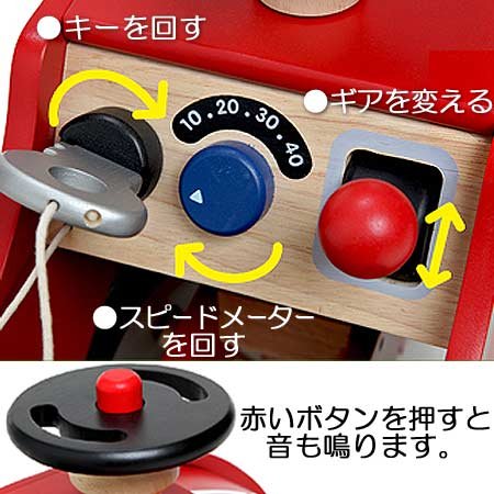 キーを回してエンジンをかけるたり、ギアを換えたり、クラクションを鳴らしたりなど、本物の車と同じように操作を真似して遊べます。