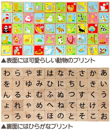 Edute(エデュテ)の可愛らしい動物のイラストを見ながら学べる木箱入りのひらがな積み木です。 ひらがな46文字に『っ』『ゃ』『ょ』『ゅ』の4文字が加わった50ピースのひらがな積み木がセットになっています。 動物園で見かける身近な動物から、ちょっと変わった動物まで49種類の動物の名前も一緒に覚えることができます。 積み木の裏面には、ひらがなの文字のみがプリントされています。 ドミノのように立てて遊んだり、かるたの様に動物の名前を読み上げて遊んだり、積み木の遊び方は色々。 裏面のひらがなを並べて言葉をつくって遊んでも楽しいですね♪ 遊んだ後は、積み木を木箱にお片づけしましょうね。
