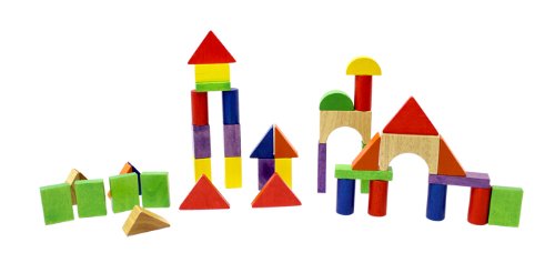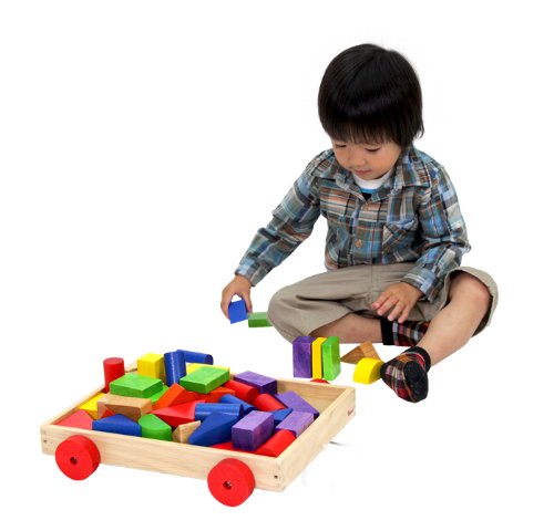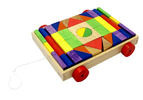 カラフルな50個の積み木が車輪付きの木箱にセットされたおもちゃ。