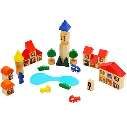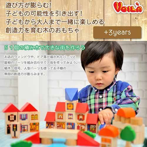 51個の木製パーツと1つの紙パーツを使って大きな街を作ることができるブロックセット。