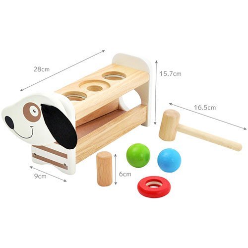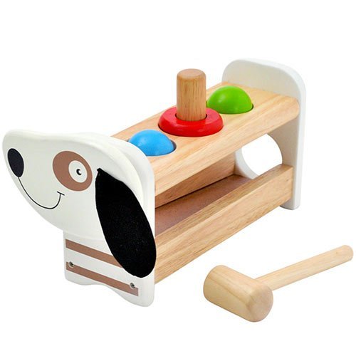 可愛い犬のカタチの本体に2色のボールと1つのペグがついており、トンカチで叩いて落とします。