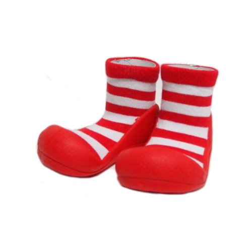 生体力学研究に基づき作られた、赤ちゃんのためのトレーニングシューズ。 底のサーモプラスチックラバーと厚みをもたせたつま先。赤ちゃんの足の形や動きを研究した結果、この形にたどり着きました。 赤ちゃんの快適な歩行をしっかりとサポートします。おしゃぶりにも使用されている安心素材。肌触りが良く、接着剤不使用なのでなんでも口にする赤ちゃんにも安心♪ 簡易的な外履きとしてもご使用いただけます。ベビーカーでのお出かけや抱っこでちょっと降ろしてあげたい時などに便利♪ 上部のアッパー部分は靴下のような伸縮性があり、足にやさしくフィットするのでいつの間にか脱げてしまってた・・・なんてことも心配ナシです! オリジナルのパッケージに入っているので出産祝いなどのギフトにおススメ!