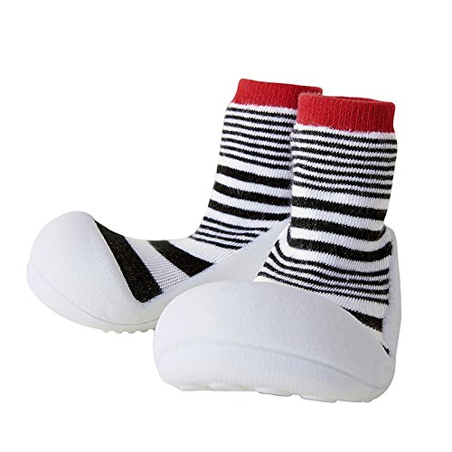 生体力学に基づき、赤ちゃんの足の形や動きを研究して作られた安心設計。靴下より保護力があって滑らず安全、しかも軽くて歩きやすいトレーニングシューズです。汚れたらお洗濯もできて衛生的。主な用途はルームシューズですが底がラバーなので簡易の外履きとしてもご使用頂けます。女の子におすすめのかわいいレッドボーダーのデザイン♪よちよち歩きの赤ちゃんをサポート!ファーストシューズにおすすめです※底に通気のための穴が空いていますので水気のある場所でのご使用はお控え下さい