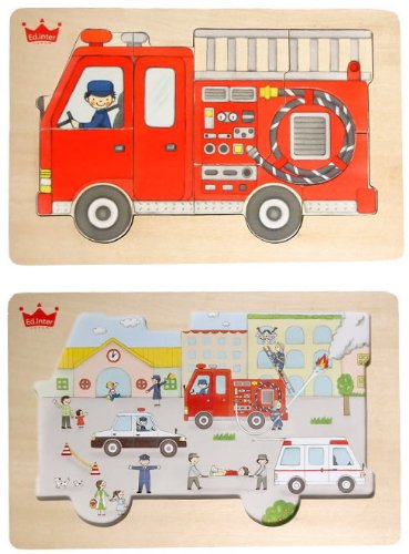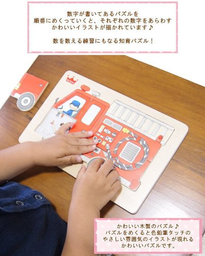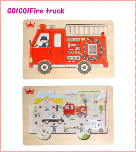 木でつくられた木製パズル♪消防車のイラストが描かれたパズルは、ピースを外すと下に救急車・パトカー・消防車が活躍するさまざまなシーンのイラストが現れます!