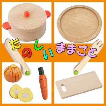 まな板、ナイフ、フォーク、お皿、お鍋、にんじん、玉ねぎがセットになった、おままごと入門セットです。ナイフでお野菜きざんでお鍋でぐつぐつ。「パパ、ママ、お料理食べて♪」。お子様の初めてのお料理、うんと美味しそうに食べてあげてくださいね♪