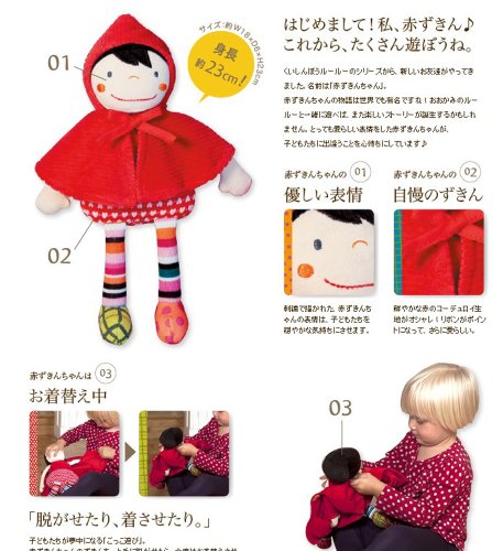 ・刺繍で描かれた、赤ずきんちゃんの表情は、子どもたちを穏やかな気持ちにさせます。 ・鮮やかな赤のコーデュロイ生地がオシャレ!リボンがポイントになって、さらに愛らしい。 ・子どもたちが夢中になる「ごっこ遊び」。赤ずきんちゃんのずきんを、上手に脱がせたら、今度はお着替えさせてあげたりと、自分でできる喜びを、体感できることもポイントです。