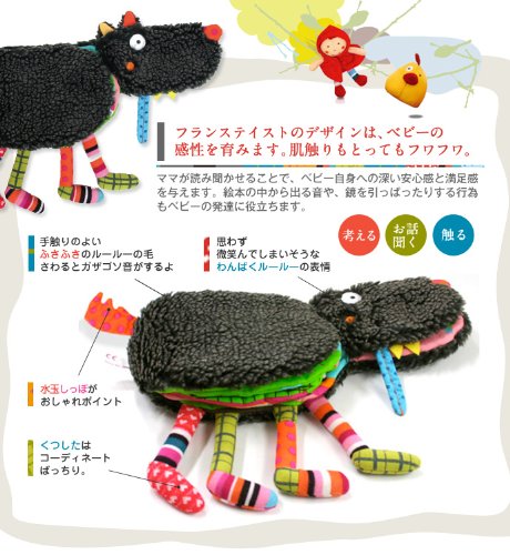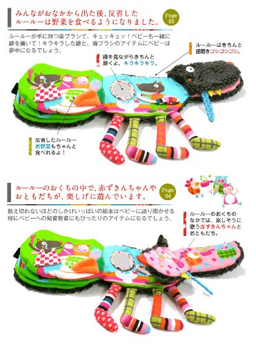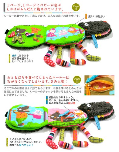 ぬいぐるみと絵本が一体になったルールーの布絵本です。 赤ちゃんが喜ぶセロファンのカサカサやチャックの開け閉め、 キラキラひかるソフトミラーの仕掛けもついています。 物語を通して社会性や生活習慣の勉強にもなります。