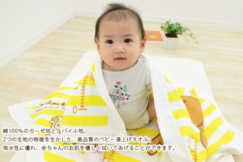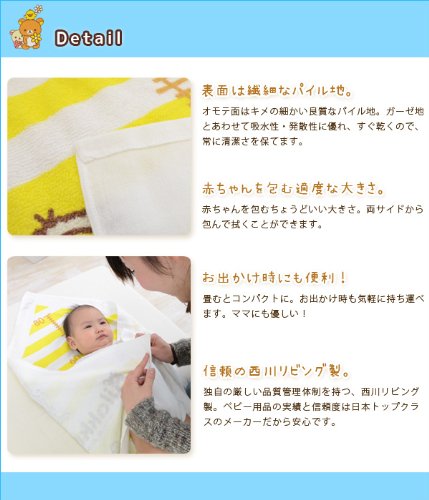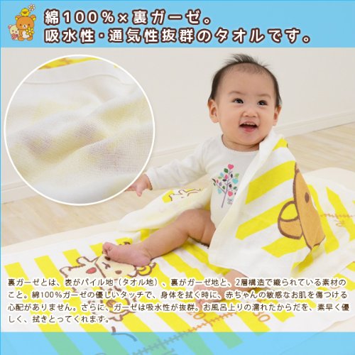 リラックマのキャラクターがかわいく描かれた、心癒されるベビー用湯上げタオル。パイル地とガーゼ地の2層構造の湯上げタオルは、デリケートな赤ちゃんのお肌を優しい肌ざわりで包んでくれます。 裏ガーゼとは、表がパイル地(タオル地)、裏がガーゼ地と、2層構造で織られている素材のこと。綿100%ガーゼの優しいタッチで身体を拭く時に、赤ちゃんの敏感なお肌を傷つける心配がありません。さらに、ガーゼは吸水性が抜群。お風呂上りの濡れたからだを、素早く優しく、拭きとってくれます。 かわいらしいデザインだけでなく、使い心地と機能性も考えられて作られた、高品質の湯上げタオルです。
