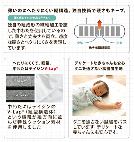 - 【敷きふとん】 1枚 約70×120cm(0.6kg) 側生地:ポリエステル80%・綿20%(高密度織)、中わた:ポリエステル100%(テイジン V-LAP使用)