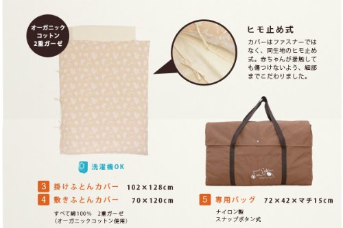 - 【掛けふとんカバー】 1 102×128cm 生地:綿100% 2重ガーゼ (オーガニックコットン)、敷きふとんカバー 1 70×120cm 生地:綿100% 2重ガーゼ (オーガニックコットン)