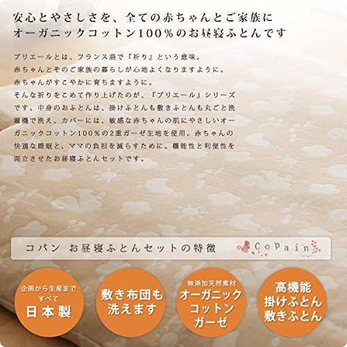 プリエールとは、フランス語で『祈り』という意味。「赤ちゃんとそのご家族の暮らしが心地よくなりますように」「赤ちゃんがすこやかに育ちますように」と、祈りをこめて作り上げたのが『プリエール』シリーズです。 中身のおふとんは、掛けふとんも敷きふとんも丸ごと洗濯機で洗え、カバーには、敏感な赤ちゃんの肌にやさしい無添加オーガニックコットンの2重ガーゼを使用。赤ちゃんの快適な睡眠と、ママの負担を減らすために。機能性と利便性を両立させたお昼寝ふとんセットです。中身のおふとんは、掛けふとんも敷きふとんも丸ごと洗濯機で洗え、カバーには、敏感な赤ちゃんの肌にやさしい無添加オーガニックコットンの2重ガーゼを使用。赤ちゃんの快適な睡眠と、ママの負担を減らすために。機能性と利便性を両立させたお昼寝ふとんセットです。