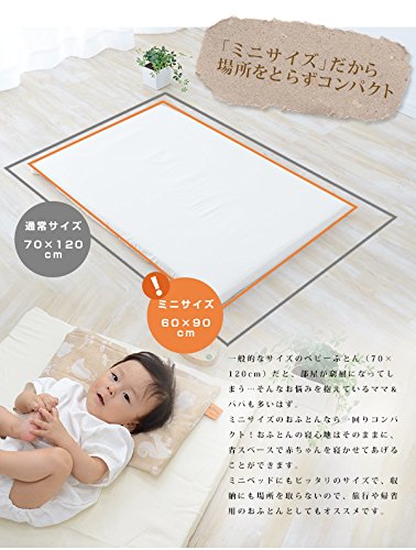 - ミニサイズのおふとんなら一般的なサイズ(70×120cm)より一回りコンパクト!おふとんの寝心地はそのままに、省スペースで赤ちゃんを寝かせてあげることができます。