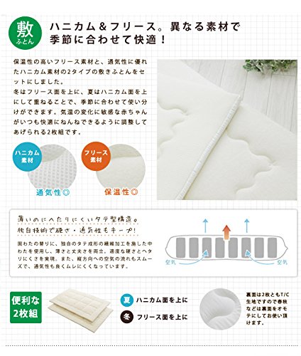 - 【敷きふとん】(フリース) 1枚 60×90cm、(中わた0.3kg) 表生地:ポリエステル100%、 裏生地:ポリエステル65%、綿35%、中わた:ポリエステル100%【敷きふとん】(ハニカム) 1枚 60×90cm、(中わた0.3kg) 表生地:ポリエステル100%、 裏生地:ポリエステル65%、綿35%、中わた:ポリエステル100%