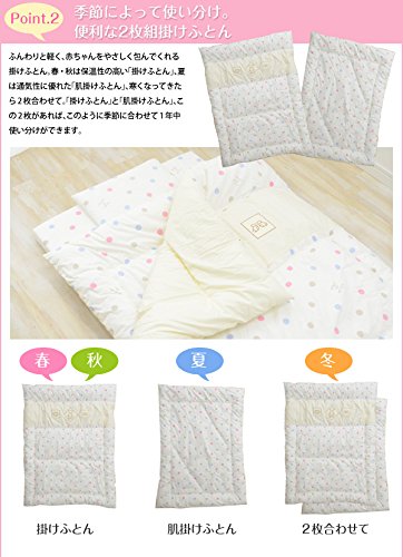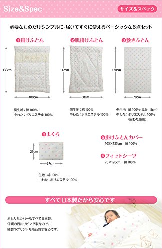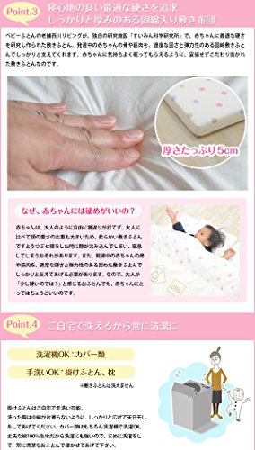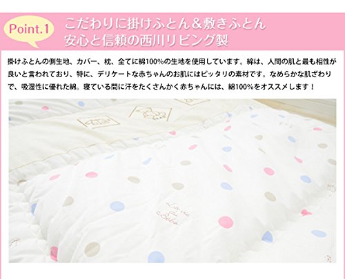 肌にやさしい綿100%を使用したふとんの生地に、かわいいカラフルな水玉模様とくまのイラストを直接プリント。カバーは真ん中に窓が開いたタイプで取替えしやすく、ママの負担も軽減してくれます。老舗のベビー寝具ブランド西川リビング製で、すべて国内で生産。高品質で安心、しかも低価格のベビー布団セットです。