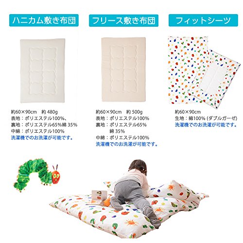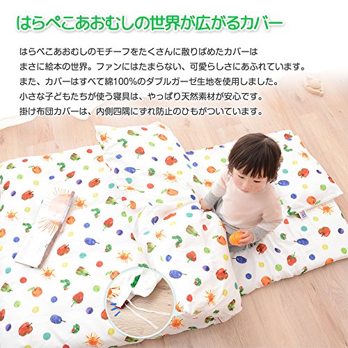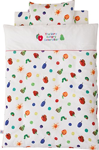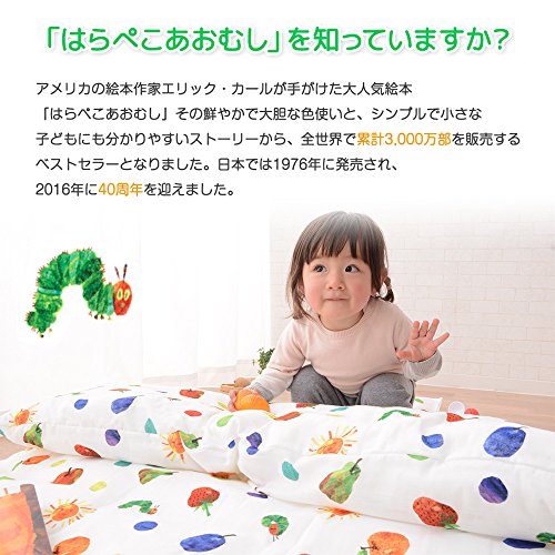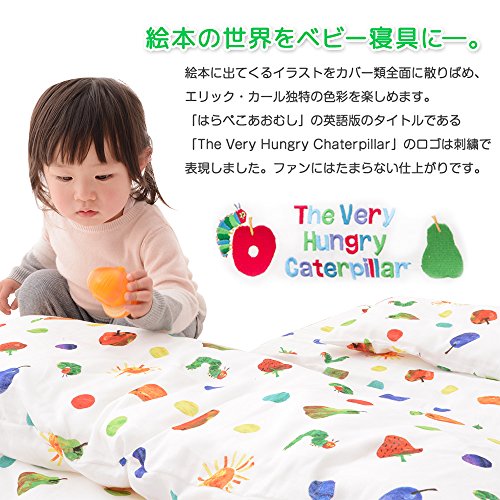 - 絵本の世界をベビー寝具に。はらぺこあおむしの世界が広がるカバー。 ベストセラー絵本「はらぺこあおむし」のイラストをカバー全面に散りばめた、布団セット。 刺繍で表現されたThe Very Hungry Caterpillaのロゴがとてもかわいい仕上がりです。 掛け布団は、肌掛け布団と合い掛け布団の2枚組。 2枚の掛け布団はスナップボタンで固定でき、ズレを防ぎます。 敷き布団も表面フリースタイプ、表面ハニカムメッシュタイプの2枚組。 季節に合わせて上にする敷き布団を選べは、1年中快適にお使いいただけます。 洗濯ネットも付いた9点セットです。