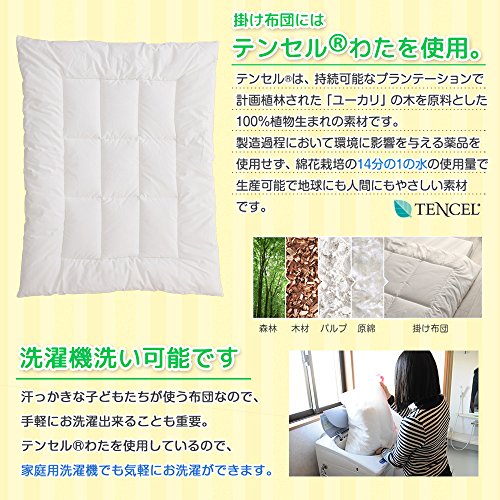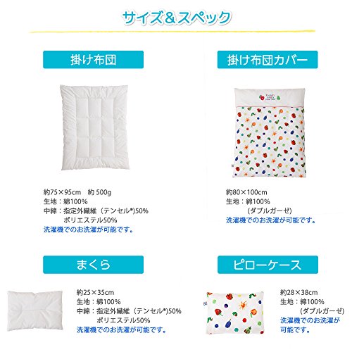 - 【掛け布団・カバー】掛け布団サイズ:約75×95cm・側生地:綿100%・中綿:指定外繊維(テンセル)50%、ポリエステル50%/掛け布団カバーサイズ:約80×100cm・側生地:綿100% (ダブルガーゼ)