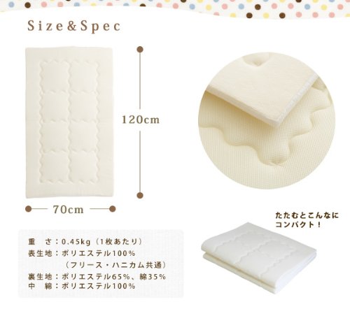 - 【敷き布団(フリース)】サイズ:70×120cm/中わた量:0.45kg/表生地素材:ポリエステル100%/裏生地素材:ポリエステル65%、綿35%/中わた素材:ポリエステル100%
