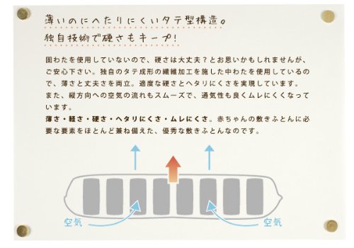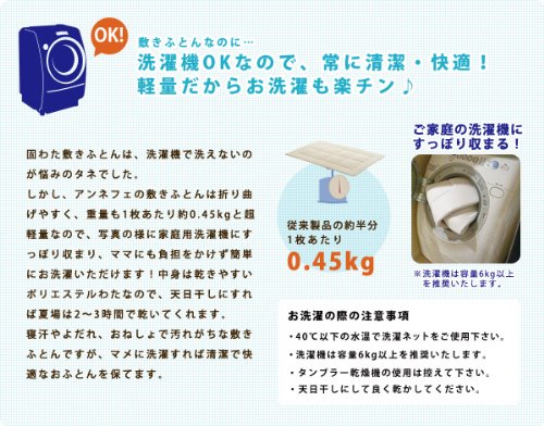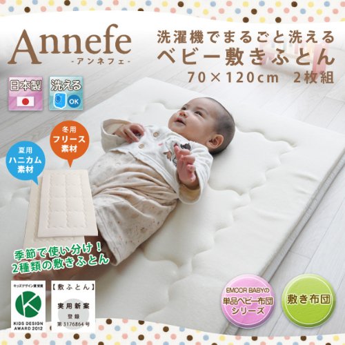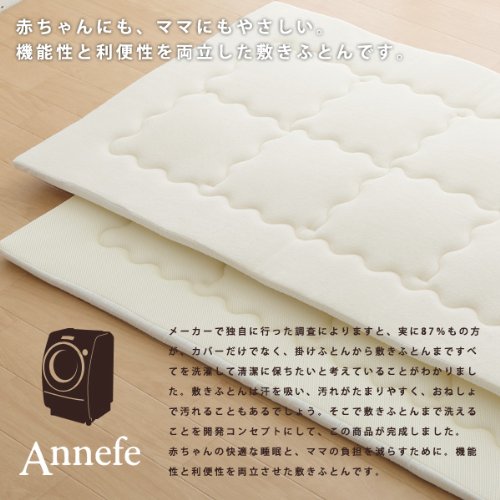 - 敷きふとんまで洗えることをコンセプトに開発されたのが、このアンネフェベビー敷き布団。 折りたたんで丸ごと洗濯機でお洗濯できるので、オネショや寝汗などで汚れがちな敷き布団でも、常に清潔に保てます。さらに、夏用(ハニカム)と冬用(フリース)の2枚組。季節に合わせて使い分けができ、便利です。赤ちゃんの快適な睡眠と、ママの負担を減らすために。機能性と利便性を両立させたベビー敷き布団です。