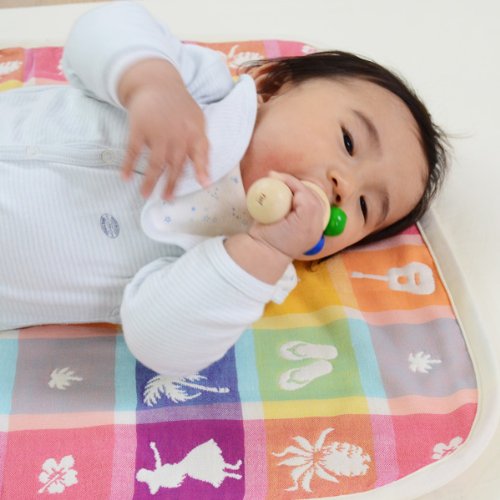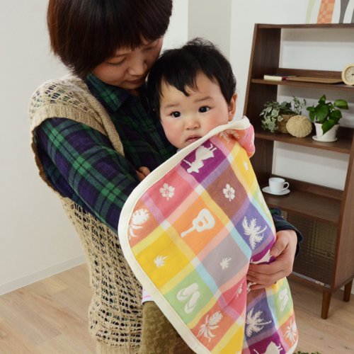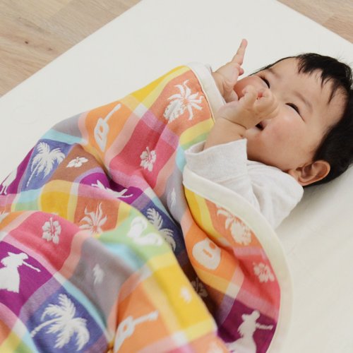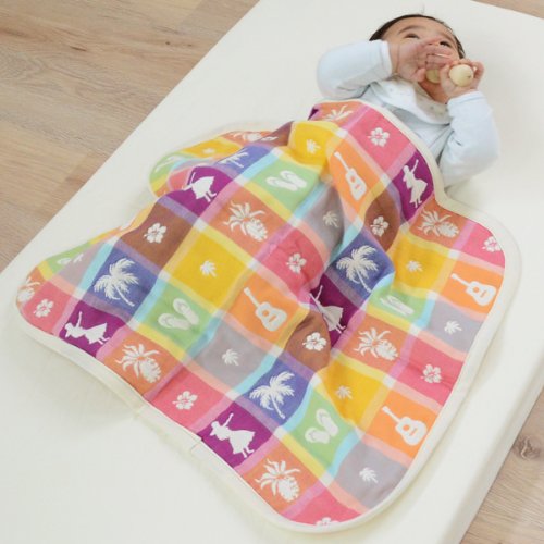 - エムールがデザインを起こし、日本で丁寧に仕上げたオリジナルの高級6重織ガーゼアイテム。テーマはハワイのお土産。南国リゾートホテル気分をご自宅で味わえる、カラフルでかわいいハワイアン柄!パインやフラガール、サンダルなど雑貨屋さんにありそうなかわいい9モチーフを盛り込んだ、9倍かわいい柄です。縦糸と横糸の色が重なってできた、ブロックチェックが味わい深いカラフルな色合いです。ミニケットは赤ちゃんのおむつ替えマットや、お昼寝用ケット、ベビーカー用のひざ掛けなど様々な使い方ができます。赤ちゃんがいるご家庭に一枚あると便利ですよ。