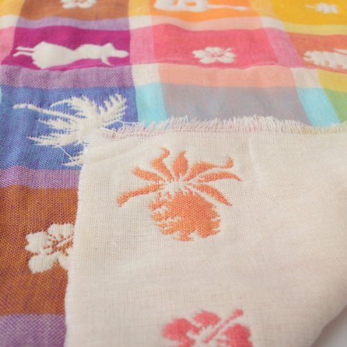 エムールがデザインを起こし、日本で丁寧に仕上げたオリジナルの高級6重織ガーゼアイテム。テーマはハワイのお土産。南国リゾートホテル気分をご自宅で味わえる、カラフルでかわいいハワイアン柄!パインやフラガール、サンダルなど雑貨屋さんにありそうなかわいい9モチーフを盛り込んだ、9倍かわいい柄です。縦糸と横糸の色が重なってできた、ブロックチェックが味わい深いカラフルな色合いです。ミニケットは赤ちゃんのおむつ替えマットや、お昼寝用ケット、ベビーカー用のひざ掛けなど様々な使い方ができます。赤ちゃんがいるご家庭に一枚あると便利ですよ。