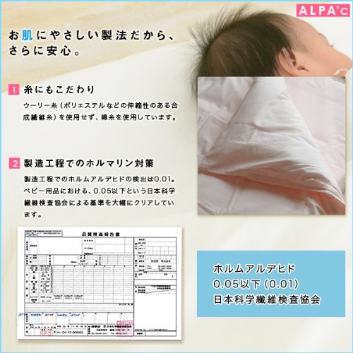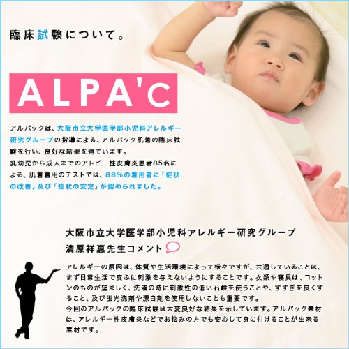 - 【特徴】ノンアレルゲン加工剤によるお肌にやさわしい仕上がり。大阪市立大学医学部小児科アレルギー研究グループの指導による、アルパック肌着の臨床試験を行い、良好な結果を得ています。