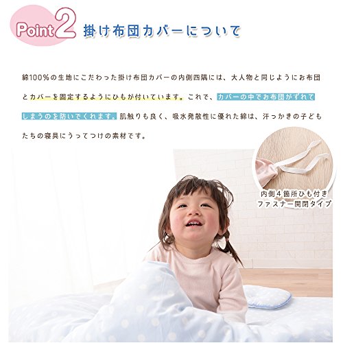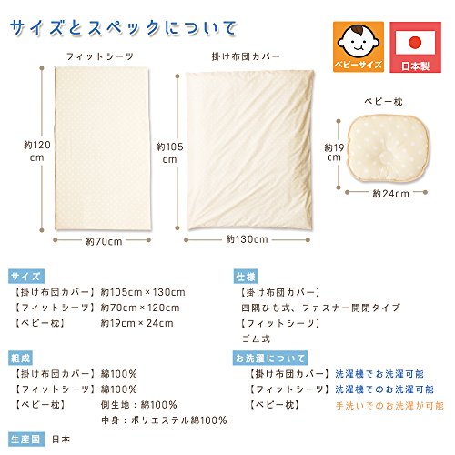 - 【サイズ/仕様】掛け布団カバー:約105×130cm(四隅ひも式、ファスナー開閉タイプ)フィットシーツ:約70×120cm(ゴム式)ベビー枕:約19×24cm