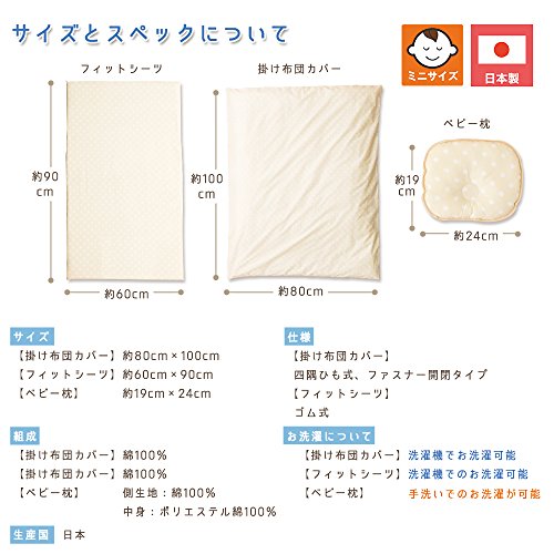 - 【サイズ/仕様】掛け布団カバー:約80×100cm(四隅ひも式、ファスナー開閉タイプ)フィットシーツ:約60×90cm(ゴム式)ベビー枕:約19×24cm