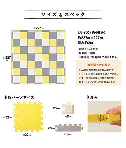 - 【素材】EVA樹脂 【お手入れ方法】・汚れた場合は速やかに水洗いしてください。 ・油汚れの場合は中性洗剤をご使用ください。 ・クレンザーや硬いスポンジ等は絶対に使用しないでください。 ・水洗いの後は陰干しをし、良く乾かしてから敷いてください。