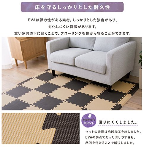 - フローリングに敷くだけで、お子様から床の冷えから守ったり、転んだ時の衝撃をやわらげるなど、お子様に安心のEVAマット。クッション性・耐水性・耐久性・保温性・防音性など、機能に富んでおり、お子様を安心して遊ばせることが出来、ママに安心を与えてくれるマットなんです。