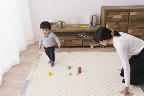 フローリングの上で使用してもケガをしないよう、従来商品と比べて中綿のボリュームをアップ。裏面にはすべり止め加工を施していますので、安心です。食べこぼしなどの汚れ気になる時にでも、ネットに入れて洗濯機で丸洗いできるので、乳幼児期の赤ちゃんにもおすすめです。