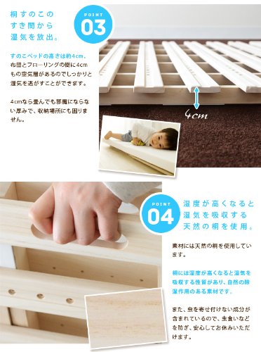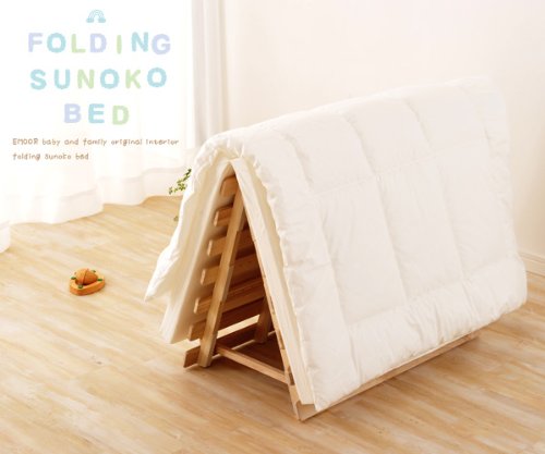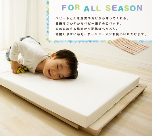 - 寝汗をたくさんかき、時にはオネショもする赤ちゃん。実に、大人の2~3倍の寝汗をかくといわれています。その汗をシーツや敷きふとんが吸い込み、やがてムレやカビとなりおふとんを傷め、赤ちゃんの睡眠にも悪影響となります。 すのこベッドは、そんな敷きふとんの湿気を発散させるアイテム。通気性の良い桐材を使用し、おふとんと床の間にすき間を作り湿気を逃します。また、2つに折りたたんで収納したり、室内での布団干し台にもなる便利な一台です。