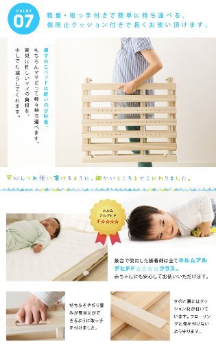 寝汗をたくさんかき、時にはオネショもする赤ちゃん。実に、大人の2~3倍の寝汗をかくといわれています。産まれたばかりの赤ちゃんは、まだ体温調節が上手にできず、そのうえ、新陳代謝が活発なので寝汗の量も多いのです。 その汗をシーツや敷きふとんが吸い込み、やがてムレやカビとなりおふとんを傷め、赤ちゃんの睡眠にも悪影響となります。 すのこベッドは、そんな敷きふとんの湿気を発散させるアイテム。通気性の良い桐材を使用し、おふとんと床の間にすき間を作り湿気を逃します。また、2つに折りたたんで収納したり、室内での布団干し台にもなる便利な一台です。 ※送料無料となりますが、北海道および九州のお届け先のお客様は税込700円の差額運賃、沖縄・離島のお客様は 別途追加料金が発生します。店舗からのメールをご確認ください。