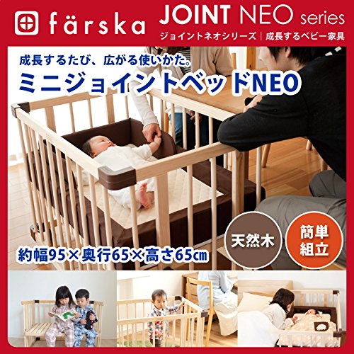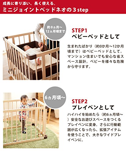 - ジョイントベッドネオは成長に合わせて使いかたが広がっていく進化系ベビーベッド。赤ちゃんの成長に寄り添うかのように、1台でベビーベッド、プレイペン、キッズ用ベンチと3通りの使いかたができ、組み立てに工具が必要ないのでママ一人でも簡単に設置できます。