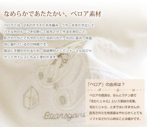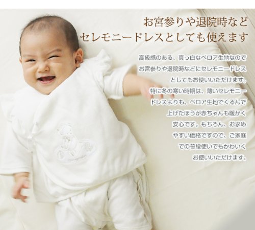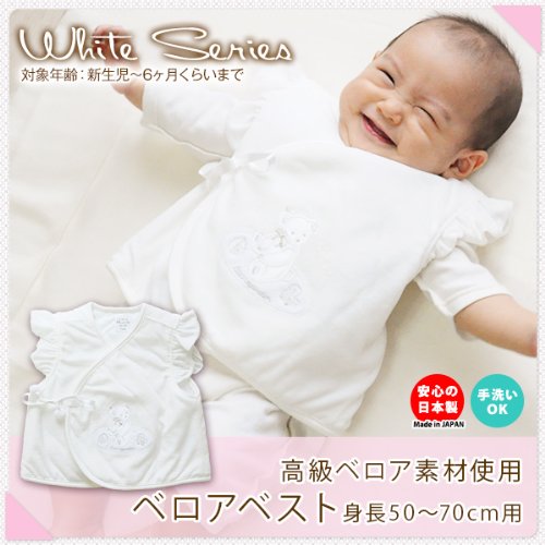 - 光沢のあるベロア素材を使用した、高級感あふれるベロアベスト。 なめらかな肌ざわりと、優れた保温性で、赤ちゃんをやさしく包み込んでくれます。高級感のある、真っ白なベロア生地なので お宮参りや退院時などにセレモニードレスとしてもお使いいただけます。 特に寒い時期は、薄いセレモニードレスよりも、ベロア生地のほうが赤ちゃんも暖かく安心です。もちろん、お求めやすい価格ですので、ご家庭での普段使いでもかわいくお使いいただけます。