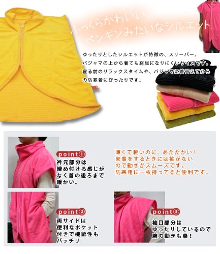 【setsuden_bedding】 機能系暖か素材hototex(ホットテックス)そ使用したローブ(スリーパー)。顎まであったかい衿元や、腰まである後ろ身頃など、これ一枚でポカポカ。 項目内容品名ホットテックスペンギンローブ(スリーパー)サイズ キッズサイズ(着丈:約70cm 身幅:約50cm)素材ポリエステル90% レーヨン10% 生産国中国製カラーブラック・ベージュ・ピンク・イエロー・グリーン