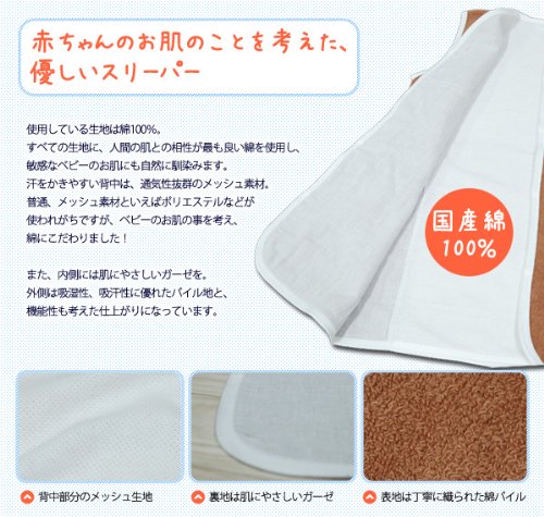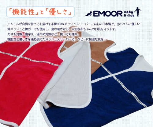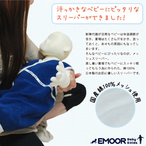 - エムールが自信を持ってお届けする綿100%メッシュスリーパー。安心の日本製で、ベビーに優しい綿メッシュと綿ガーゼを使用し、夏の暑さから、大切な赤ちゃんのお肌を守ります。