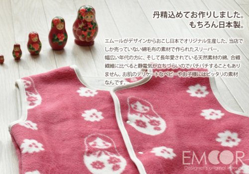 かわいいマトリョーシカパターンを日本製の安全安心高品質な綿毛布のスリーパーにしました。当店でしか販売していないため、プレゼント・誕生日・出産祝いにもぴったりです。赤ちゃんのうちは、おねんねの際のスリーパーとして。小さい頃は、脚部のボタンを留めてズボンの様に。大きくなったらベストのようにお使いいただけます。生地の染め色、パターンのデザイン、商品展開などすべてエムールが考え抜いた、完全オリジナルアイテム。普通ならこのグレードの毛布はもっと高いはずですが、このかわいいマトリョーシカデザインの毛布をより多くのお客様にご利用いただきたいので手頃な価格に抑えました。ご自宅用はもちろんのこと、プレゼントにも最適な一枚です。