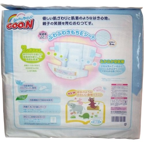 優しい肌ざわりと肌着のようなはき心地 ママの手みたいに、ふんわりやさしい 1.ふわふわきもちEシートが、なめらかで肌にやさしい。 2.空気を含んだ「ふかふか空気層」が、ふわふわでやわらかい 3.3Dエンボス加工で赤ちゃんのお肌の負担軽減。シートのくぼみが軟便をしっかり吸収 4.おしっこ お知らせマークつき。 5.全面通気性バックシート使用。 【適用】 体重5Kgまで 【素材】 表面材・・・ポリオレフィン系不織布 吸水材・・・綿状パルプ、吸収紙、高分子吸水材 防水材・・・ポリオレフィン系フィルム 止着材・・・ポリオレフィン系フィルム 伸縮材・・・ポリウレタン 結合材・・・スチレン系合成樹脂 等